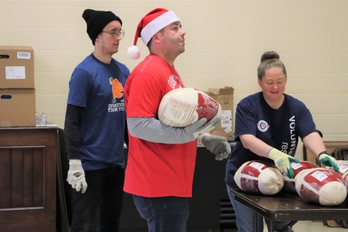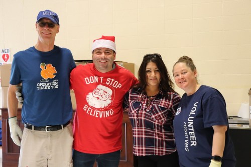 At the weekend distribution, three active duty airmen helped carry frozen turkeys. Air Force Staff Sgt. Ashley Warden is in the volunteer reserves for Operation Homefront and this year brought along Air Force Master Sgt. William Laflair and Master Sgt. Nancy Horsey.