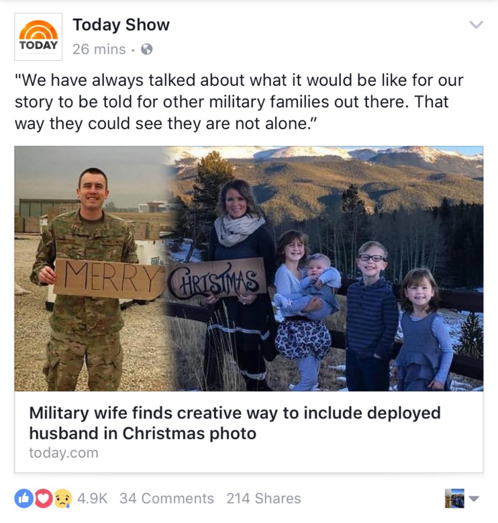 I pieced them together that night and decided to post them on FaceBook. The response was unbelievable! Within a few days, it was EVERYWHERE! So many spouses reached out saying “We’re apart for the holidays too! Thank you for showing us your togetherness through it all!”.