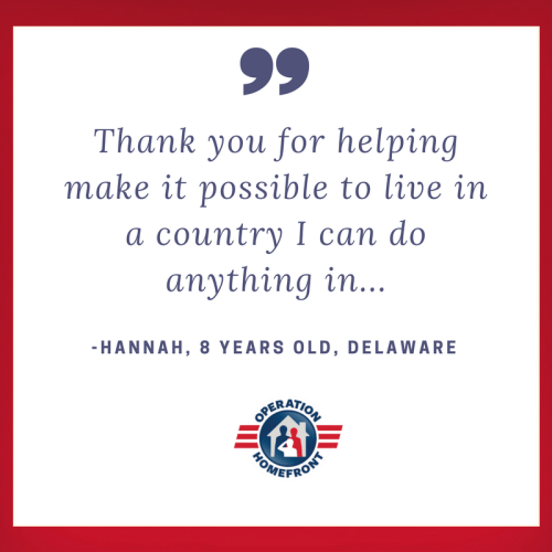 -Thank you so much for your service! My name is Hannah, I am 8 years old, I am a member of American Heritage Girls in which I am currently learning about the military and I want to thank you for all you have done. Thank you for going away from your family and risking your life just to keep me safe. Thank you for helping make it possible to live in a country I can do anything in.–Hannah, Delaware